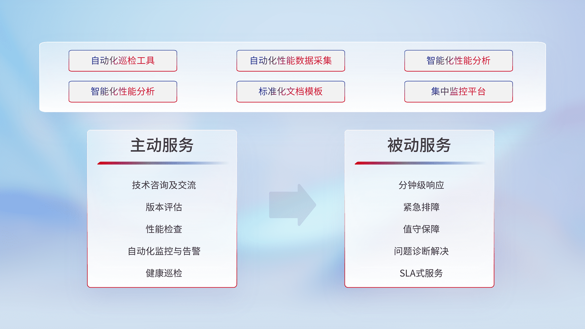 智能化工具和标准化文档,,,,保障服务质量,,提供主动服务(包含技术咨询、、版本评估、、性能检查、、、、自动化监控与告警、、、、健康巡检)和被动服务包含(分钟级响应、、、、紧急排障、、、值守保障、、问题诊断解决、、SLA服务)。。。。