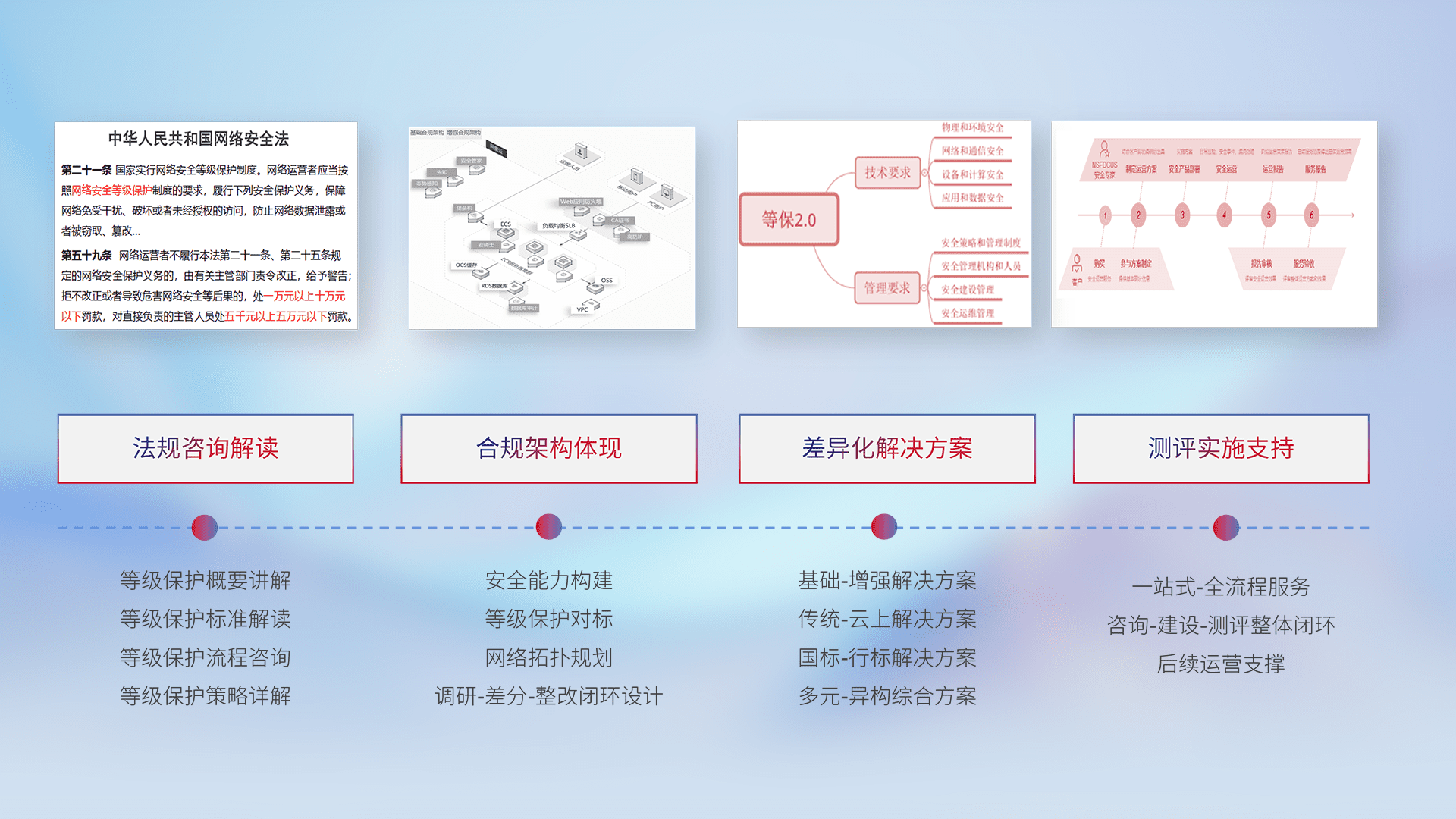通过专业的法律咨询解读、、、合规架构体现、、、差异化解决方案、、、、测试实施支持等服务,,,为客户量身打造等保合规体系。。