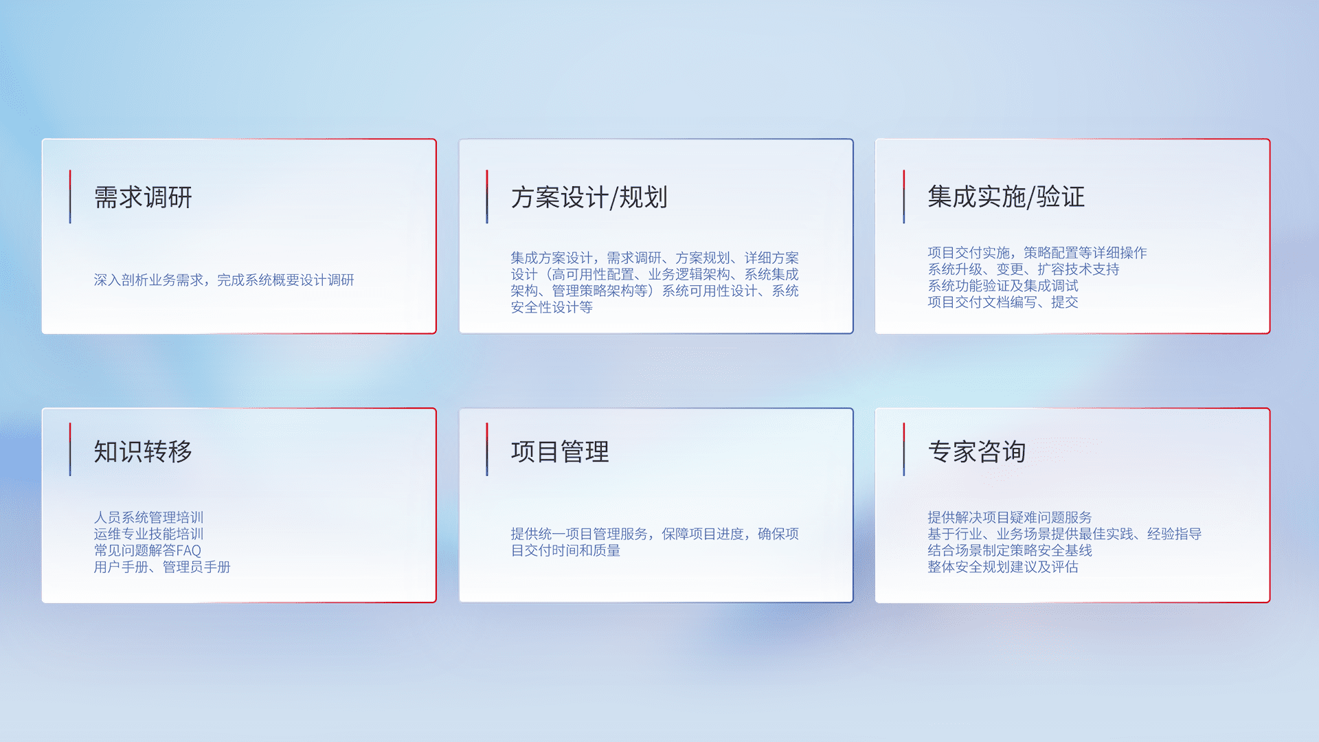 针对客户行业特性,,,,将宏观的安全战略和需求,,,,通过专业的交付服务,,,实现项目落地,,,,为客户提供标准规范的集成交付服务。。